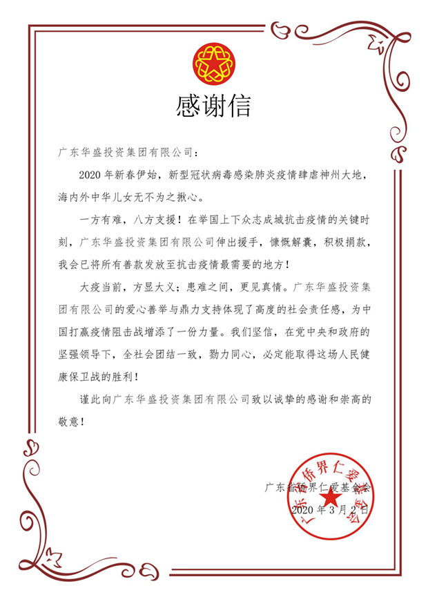 近日。新型冠状病毒感染肺炎。引发的疫情牵动着每个中华儿女的心。2020年1月27日,广东省侨联和广东省侨界仁爱基金会发出驰援抗击疫情的倡议,集团董事长郑继坤先生、总经理郑林栋先生即以广东华体会官方网页版集团设立的“侨爱南粤·添一基金”名义捐赠10万元,助力抗击疫情,表达企业应有的社会责任。